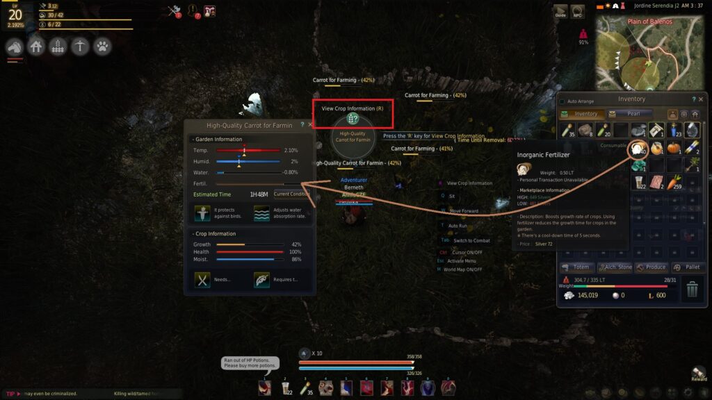 Když si u rostliny otevřete okno s informacemi, tak se vám vypíší informace, zda je řádně zalitá, pohnojená atp. Pokud máte hnojivo a vodu, můžete při tomto otevřeném okně otevřít i svůj inventář a pravým tlačítkem kliknout na hnojivo či vodu a tím to na plodinu aktivujete. Určitě není vhodné plodiny přehnojit nebo zaplavit vodou. Nevím, zda se dá použít i jiná voda, ale já použila tu „mineral water“, co se dá koupit v hospodě u kuchaře za 30 stříbrných.
